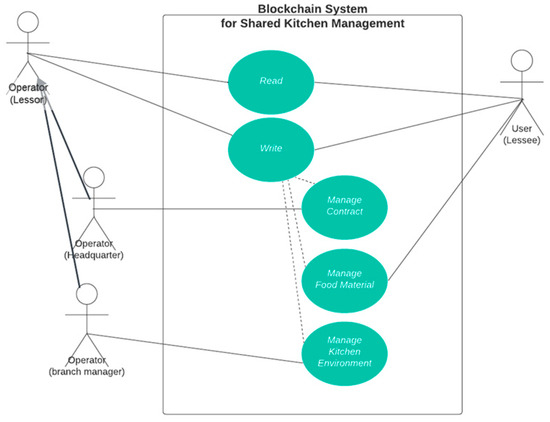 A shared-kitchen ecosystem involves multiple stakeholders, from leaseholders and lessees to shared-kitchen branches and regulatory bodies. Roles and responsibilities vary among stakeholders, necessitating a blockchain-based management system that defines roles, management scope, and access rights to information. This study designs safety management criteria and system participant roles, reflecting the unique characteristics of shared kitchens to create a comprehensive safety management platform. The proposed blockchain system also extends from private to consortium networks to accommodate diverse user groups. We discuss the design of a consortium network and the configuration of user groups with tailored data access levels and functional roles, focusing on South Korean shared kitchens. The proposed system assesses functional requirements based on South Korea’s Ministry of Food and Drug Safety guidelines. To summarize, we outline the following research questions: (1) Who are the stakeholders in shared-kitchen food safety, and how should their roles and responsibilities be defined? (2) Based on these definitions, how can a blockchain system be designed for shared-kitchen management, and what functional requirements are essential? (3) What are the critical use cases, required data structures, and flow mechanisms?