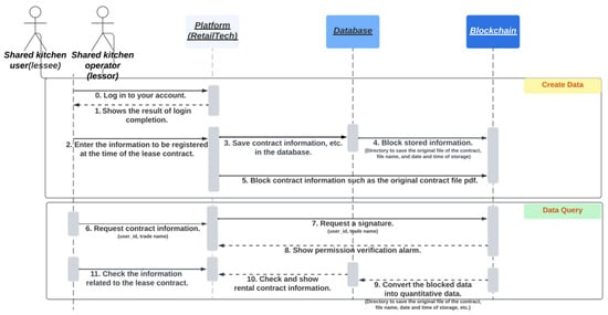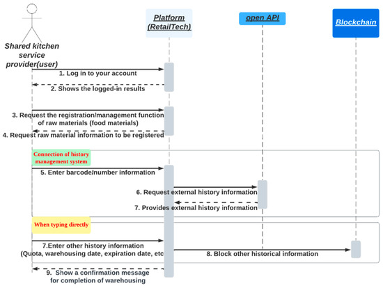 In this section, we aim to develop a blockchain-based use case designed for practical system implementation. This study was conducted using field tests in collaboration with the Wanju County Office, which currently offers shared-kitchen services to lessees and has designated an on-site verification test bed. Because the previously defined on-chain items and the scenarios for each case for use reflect actual shared-kitchen operations, the present research’s validity is substantiated. A sequence diagram was created to illustrate the functions specified in the use case. A sequence diagram—a behavioral diagram—depicts the interactions and the sequence in which they occur among various objects. This approach represents the scenario the existing system will follow. One can easily understand the scenarios using sequence diagrams due to their detailed insights into other systems’ use cases, such as APIs, and model logic, like API calls. Sequence diagrams clarify the order of interactions among actions and actors. In this study, various entities, such as shared-kitchen operators and users, contribute to generating or querying data related to food history and kitchen safety management. Thus, sequence diagrams are utilized here to outline the system’s use plan for blockchain-based history tracking.