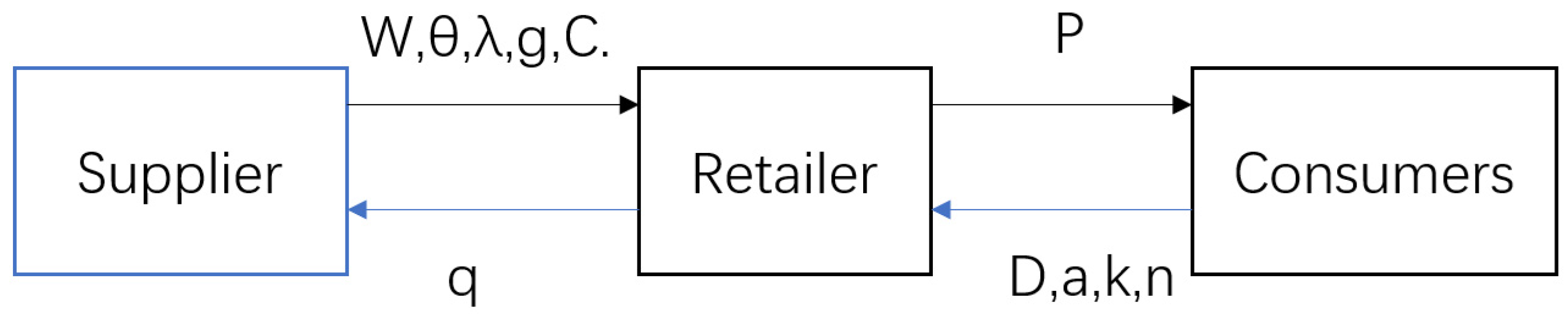 The supplier’s unit cost of producing fresh products is c, the product freshness is , and the wholesale price to the retailer is w. The retailer orders q quantities of fresh products according to the predicted market demand and sells them to consumers at the sales price p.
