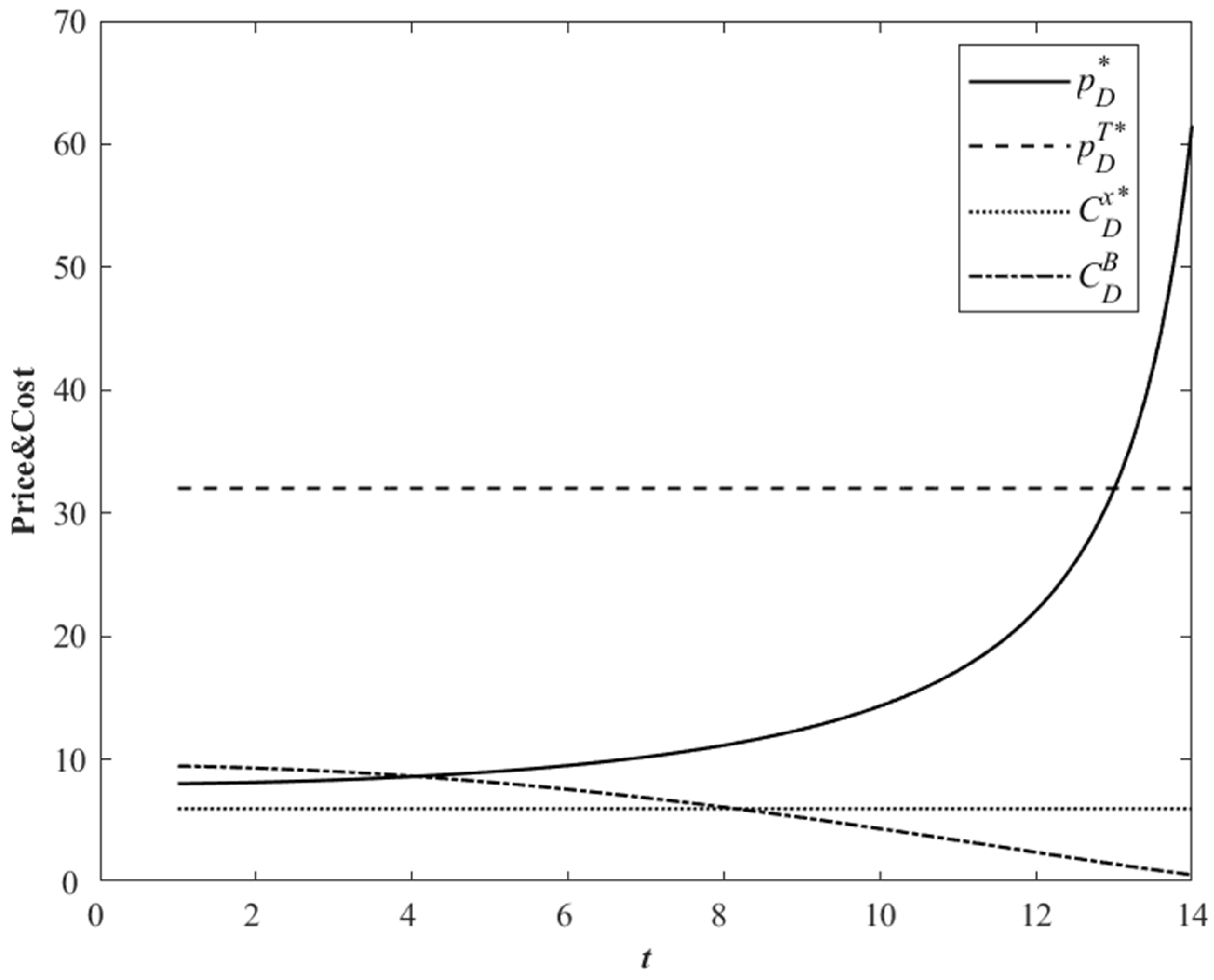 In order to test the effectiveness of the model, under the condition that the relevant parameters meet the above constraints, the following numerical values are used for analysis. Assume that the original market size a = 1,000,000, the unit production cost of fresh products c = 2, the price sensitivity coefficient k = 2, the information sensitivity coefficient n = 1.5, the life cycle of fresh products T = 15, and the time after production t = 5.