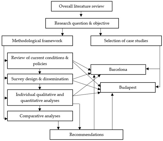Considering the nature of the objective, linked to diverse disciplines such as transportation engineering, policymaking, sociology, and psychology, among others, a twofold methodology comprising both qualitative and quantitative analyses has been chosen. This methodology is shown in Figure 1 within the overall context of this research.
