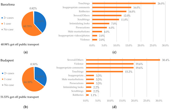 With regard to actual experiences, Figure 2 shows that almost all respondents in both cities had experienced or observed unwanted behaviors on public transport or as part of a woman’s journey. Indeed, most of them (more than 60%) have suffered or seen them more than once. More than 50% of these women in Budapest left the vehicle, with the percentage in Barcelona being a bit lower (40.98%). The frequency of each possible type of unwanted behavior was different in each city. It is worth highlighting that severe harassment linked to violence was reported by 20% of the Budapest respondents, in comparison to 2% in Barcelona. It was also very common in Budapest (>30%) that women suffered unwanted behaviors involving several inappropriate conducts (e.g., inappropriate comments followed by persecution and touching). Both touching and inappropriate comments were quite common in both cities. Conversely, the rate of robberies (note than women argued that they felt like more accessible victims) was higher in Barcelona (14% in comparison to 1.1%).