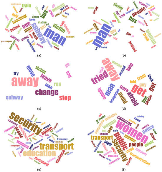 Results of word frequency analyses for free answer questions related to (a) harassment episodes suffered/observed in Barcelona; (b) harassment episodes suffered/observed in Budapest; (c) reaction to harassment episodes suffered/observed in Barcelona; (d) reaction to harassment episodes suffered/observed in Budapest; (e) women’s proposals to avoid harassment on public transportation in Barcelona; (f) women’s proposals to avoid harassment on public transportation in Budapest.