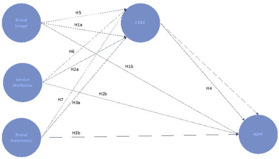 Each day, passengers have a greater pool of airline companies to choose from, making them more experienced and in search of higher levels of service. This translates into clients being more willing to switch airlines if they are not satisfied with the provided service []. Service attributes are important to create high levels of service: if the airline has the right service attributes and they are well-executed, service levels increase. If passengers demand higher service levels, it means they value these service attributes, making this variable important for an airline company to build brand value. This brings us back to the concept of CBBE. As already argued by Mourad et al. [] for the higher education industry, service attributes can be seen to influence brand equity. Thus, we propose that service attributes can be interpreted as an independent variable when influencing CBBE and WPP, due to their high value for service industries, and that their influence also applies to the airline industry, following the proposed hypothesis: