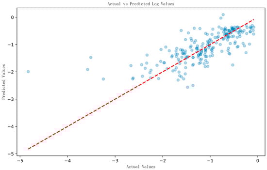 Figure 3 further evaluates the predictive performance of the model by illustrating the relationship between actual values and predicted values derived from the test set. The scatter points representing the actual and predicted values are predominantly clustered around the diagonal line y = x, suggesting a notable degree of consistency between the model’s predictions and the actual outcomes. The distribution of scatter points is relatively uniform on either side of the diagonal, indicating the absence of systematic bias; in other words, there is no significant overestimation or underestimation present. Nevertheless, some outliers are discernible within the scatter plot, with points located farther from the diagonal, highlighting larger prediction errors in specific instances. Additionally, the density of scatter points is greater in the central range of both the horizontal and vertical axes, suggesting that the model’s predictions are more accurate within this range.