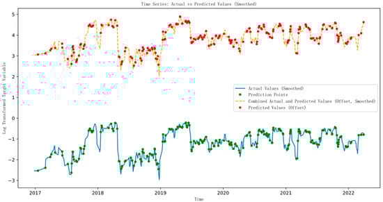 Moreover, to clearly illustrate the prediction results for time series data, true values and predictions are combined into a single time-ordered plot. A time series graph is generated, showcasing both actual and predicted values, with Gaussian smoothing and an overall shift applied to the predictions for enhanced clarity. Prediction points are highlighted on the graph to facilitate a clearer comparison between predicted and actual values. The final model converged after 26 iterations, yielding an  value of 0.5092. Detailed results are depicted in Figure 2, Figure 3 and Figure 4.