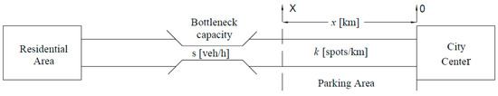 The capacity of the bottleneck is s (in veh/h). Consistent with the assumption in Arnott et al. [19], which posits that commuters must rely on either on-street or off-street parking in the absence of employer-provided parking, we assume the existence of a parking area extending X kilometers from the city center towards the bottleneck. The parking density in this area is denoted by parking spots per kilometer.