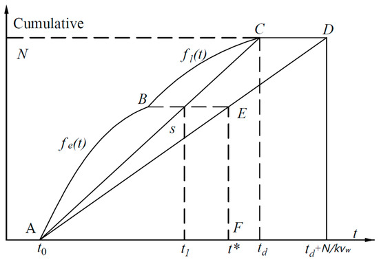 Considering the above discussion, the time-dependent equilibrium flow pattern can be obtained, as shown in Figure 2, where is the actual arrival time of the last commuter.