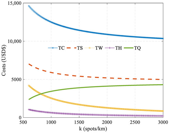Considering the case where the departure rate of early commuter arrival is higher than the bottleneck capacity (i.e., ), we can derive that the parking density should satisfy the condition . Without loss of generality, we set the basic value of the parking density to ), which means that a commuter, on average, can find a parking spot every 1.67 m along the corridor. The results regarding the change in various costs with respect to k are presented in Figure 3.