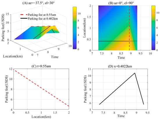 To better understand the results, we extract two specific examples, which are the red dotted line and black solid line shown in Figure 4A,B. The red dotted line represents the parking fee at different parking locations when the commuter reaches the parking area at 8:55 a.m., which is shown in Figure 4C. The black solid line represents the parking fee at various departure times when the commuter is parking at a location that is 0.404 km from the city center, which is shown in Figure 4D.
