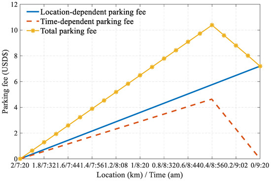 In terms of Equation (33), we set the parameter a as 3.6 (USD/km). Therefore, the parking fee corresponding to the departure time and parking location can be expressed as shown in Figure 4.