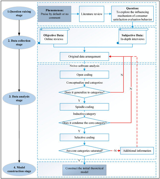GT has a set of standardized research processes; the main idea is based on primary data, using induction and deductive methods, with the help of open coding, axial coding, and selective coding, three processes from which to mine and construct a theoretical framework [41]. Among them, the most critical step is data analysis. Through three levels of coding, data are processed step by step, and then the main categories are gradually separated. Through the question-raising stage, data collection stage, data analysis stage, and model construction stage, we analyze and explore CSEB in depth to reveal the real mechanism of CSEB in the context of social e-commerce. The specific research stage is shown in Figure 1.