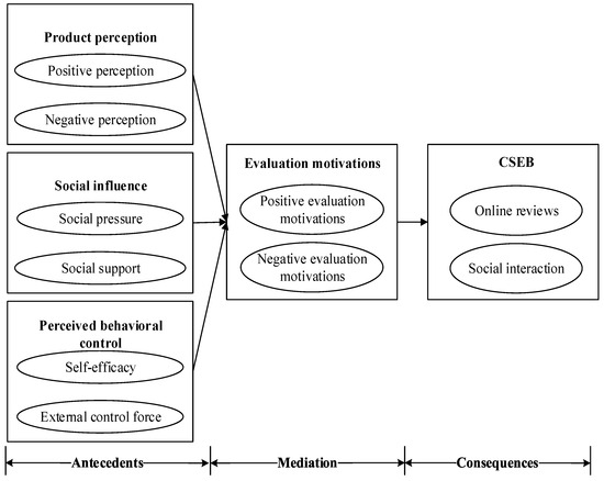 Selective coding is a further induction of the axial coding, according to the relationship between the main categories, and the “story line” is generated, and the core category is excavated. Through the discussion and analysis of three doctoral students, the core category of “influence mechanism of CSEB” was determined. The logical idea could be summarized as product perception, social influence, perceived behavior control (antecedents), evaluation motivations (mediation), and CSEB (consequences). Finally, a CSEB model is constructed, as shown in Figure 3. The model explains that consumers produce evaluation motivations as the mediating factor under the action of product perception, social influence, and perceived behavior control and form a purposeful CSEB.