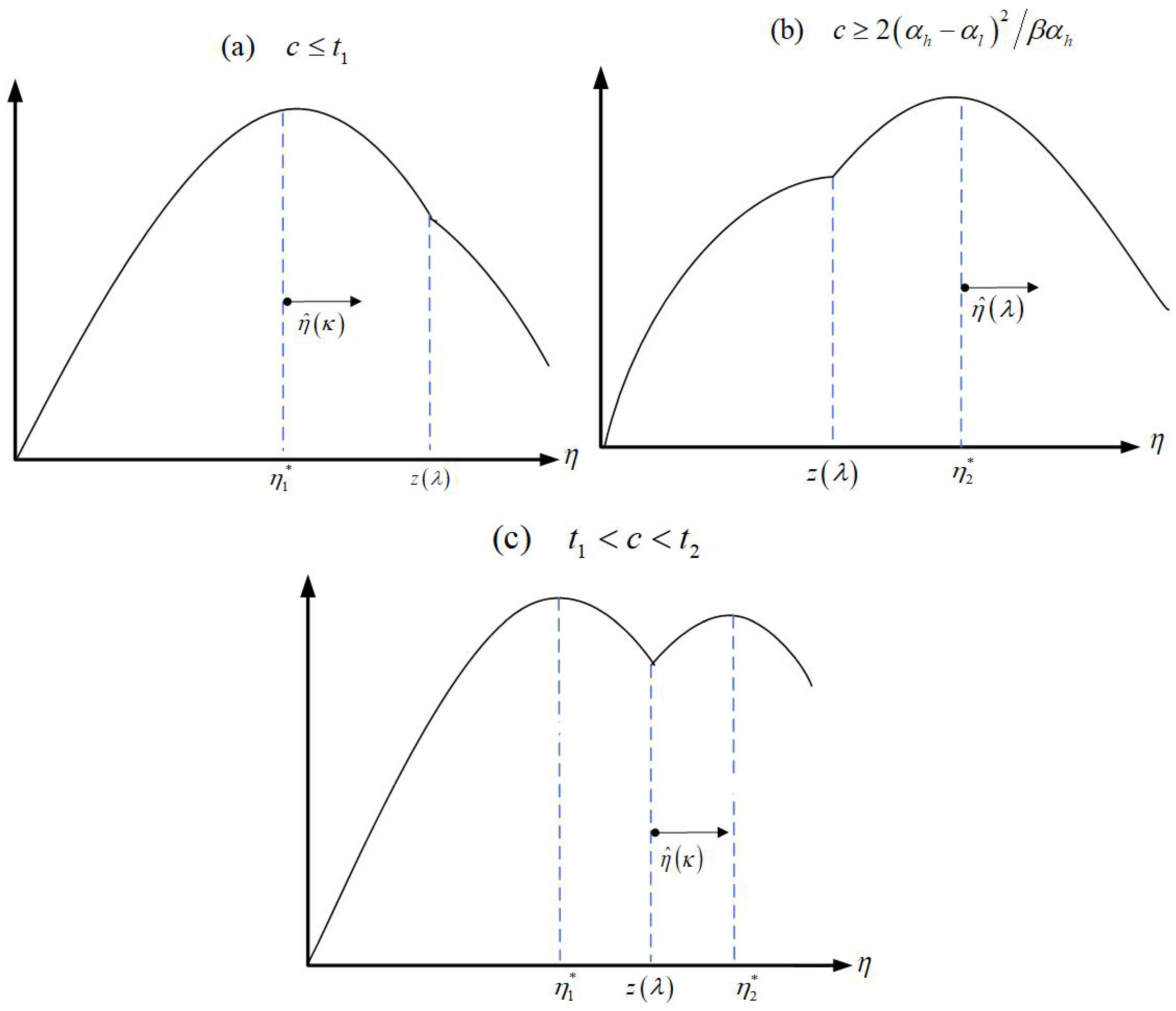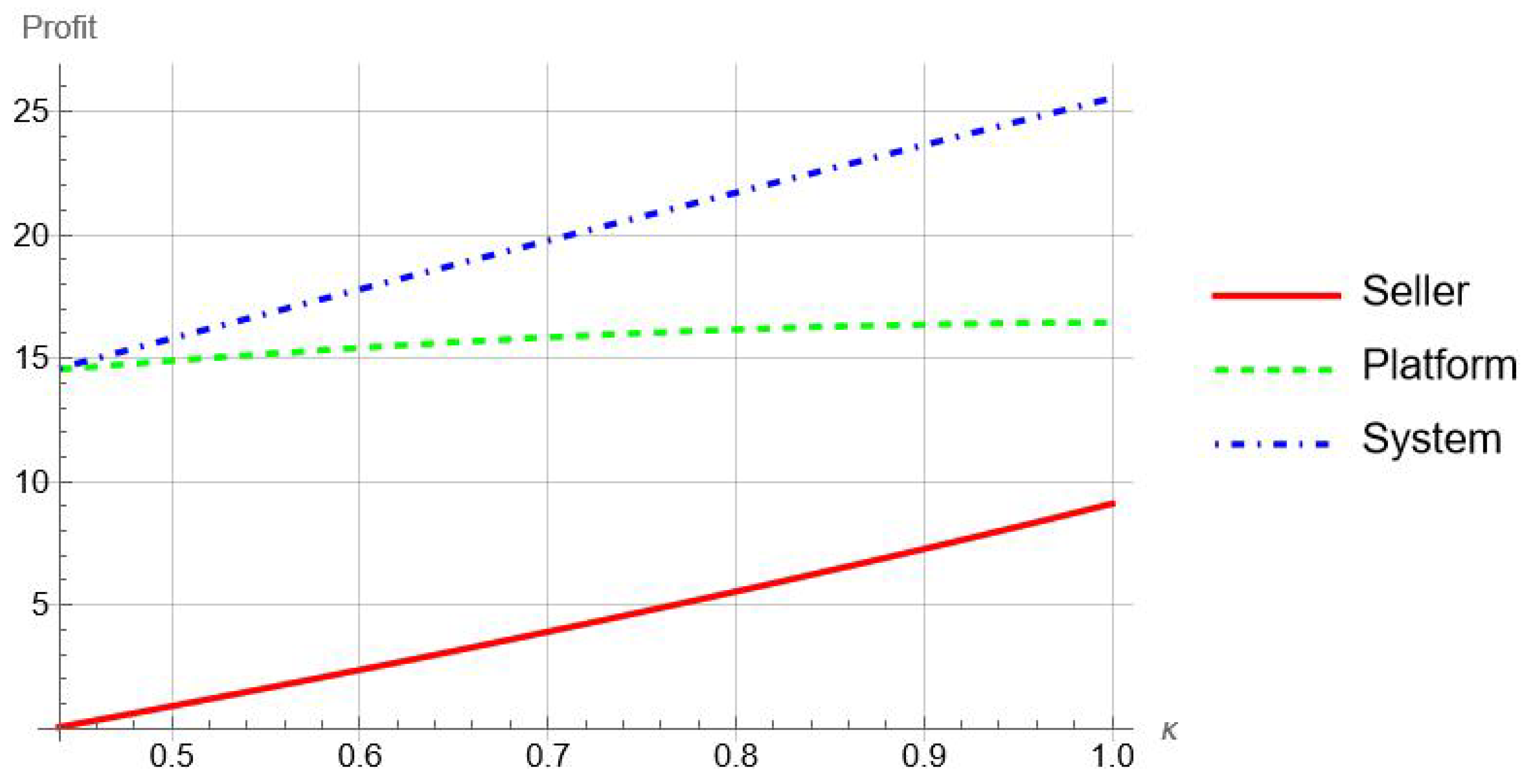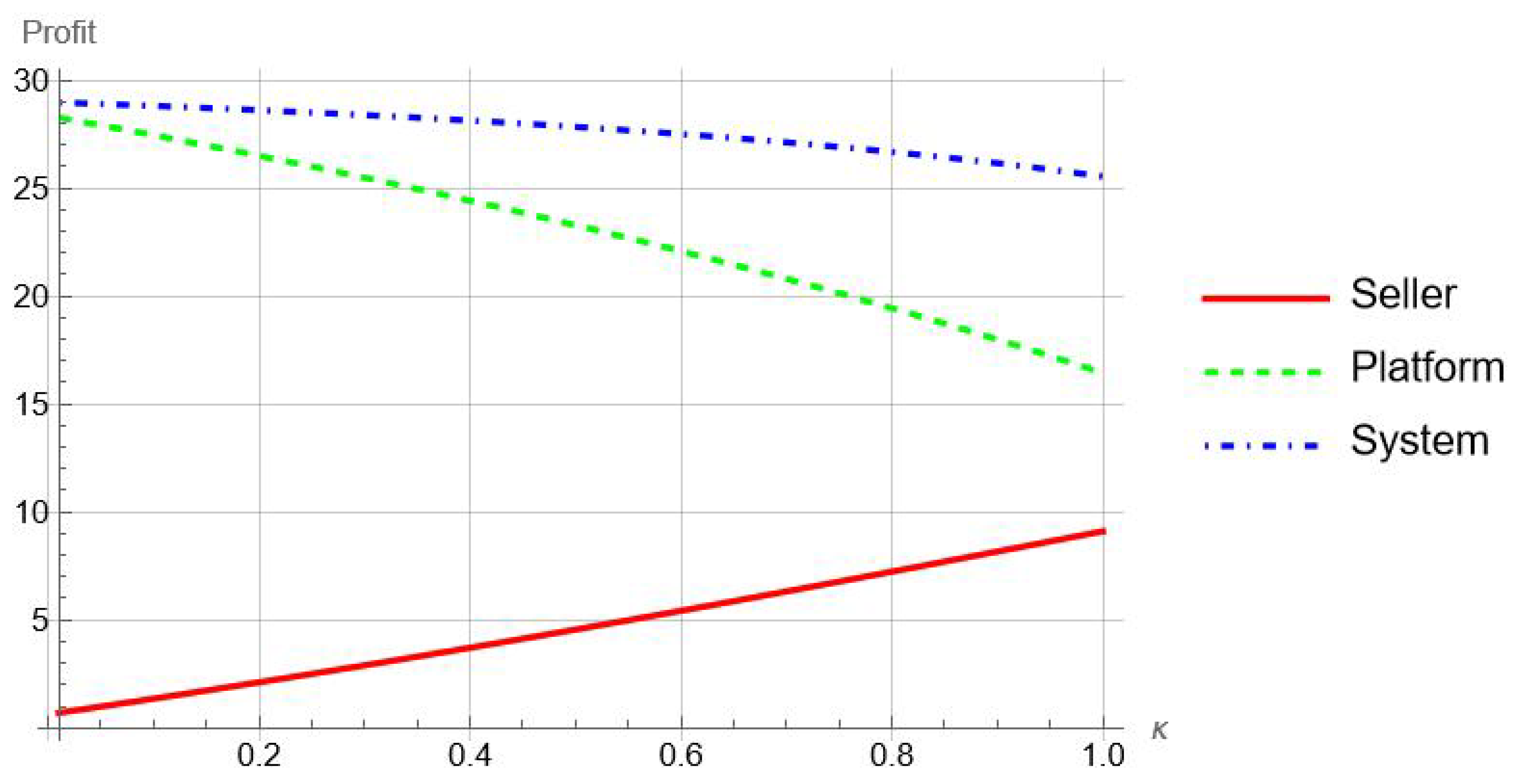 - Case 2: . In this case, for a given , the platform’s expected profit isIt is easy to verify that is first increasing and then decreasing in so that the optimal commission rate is .