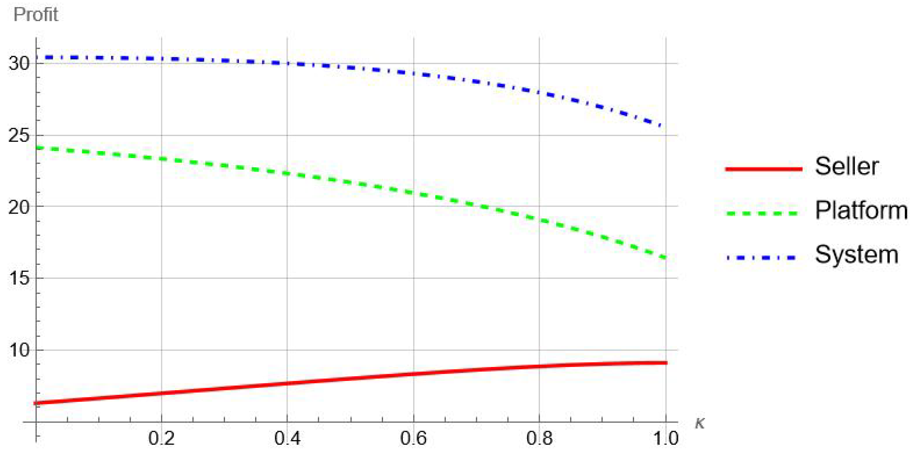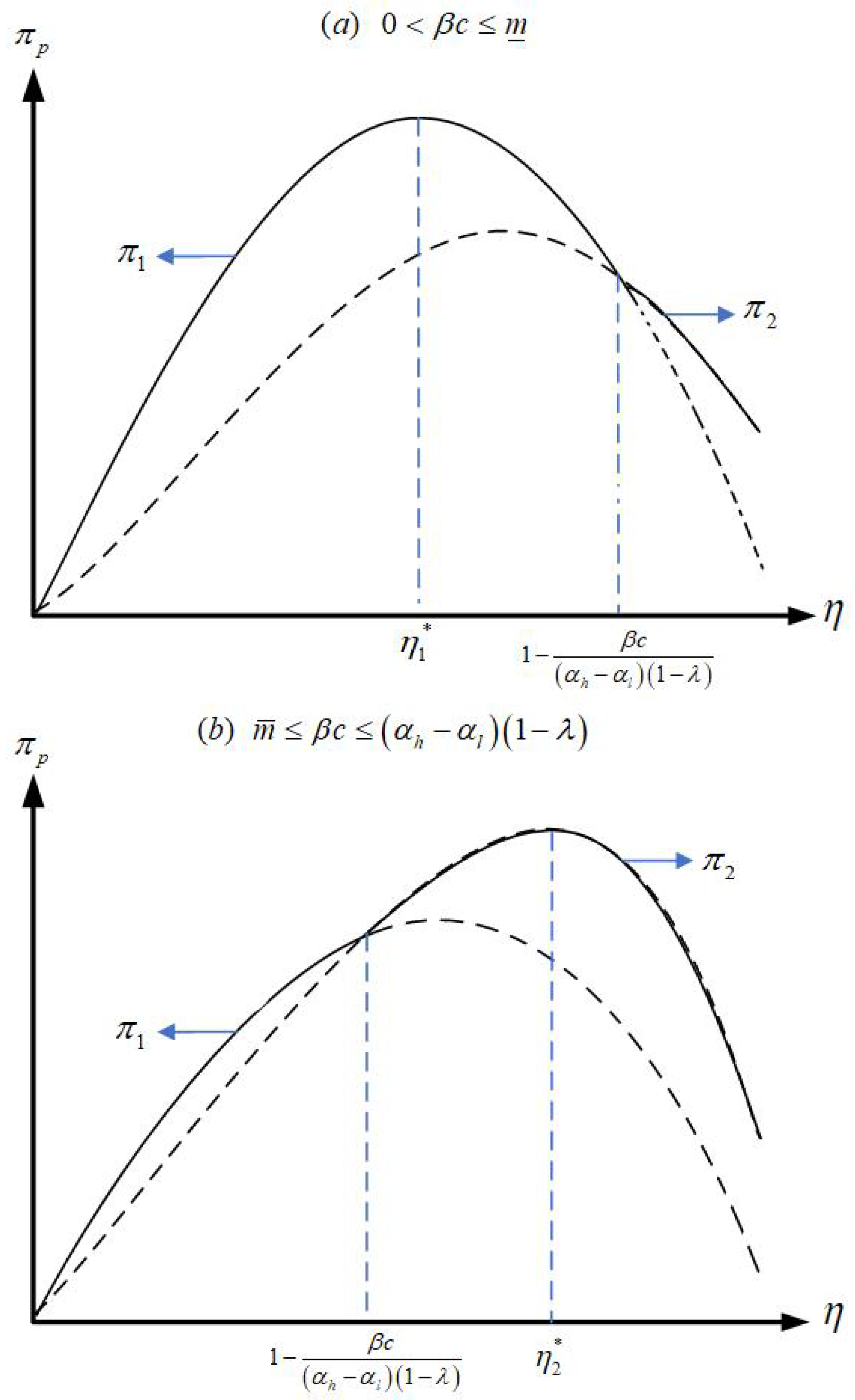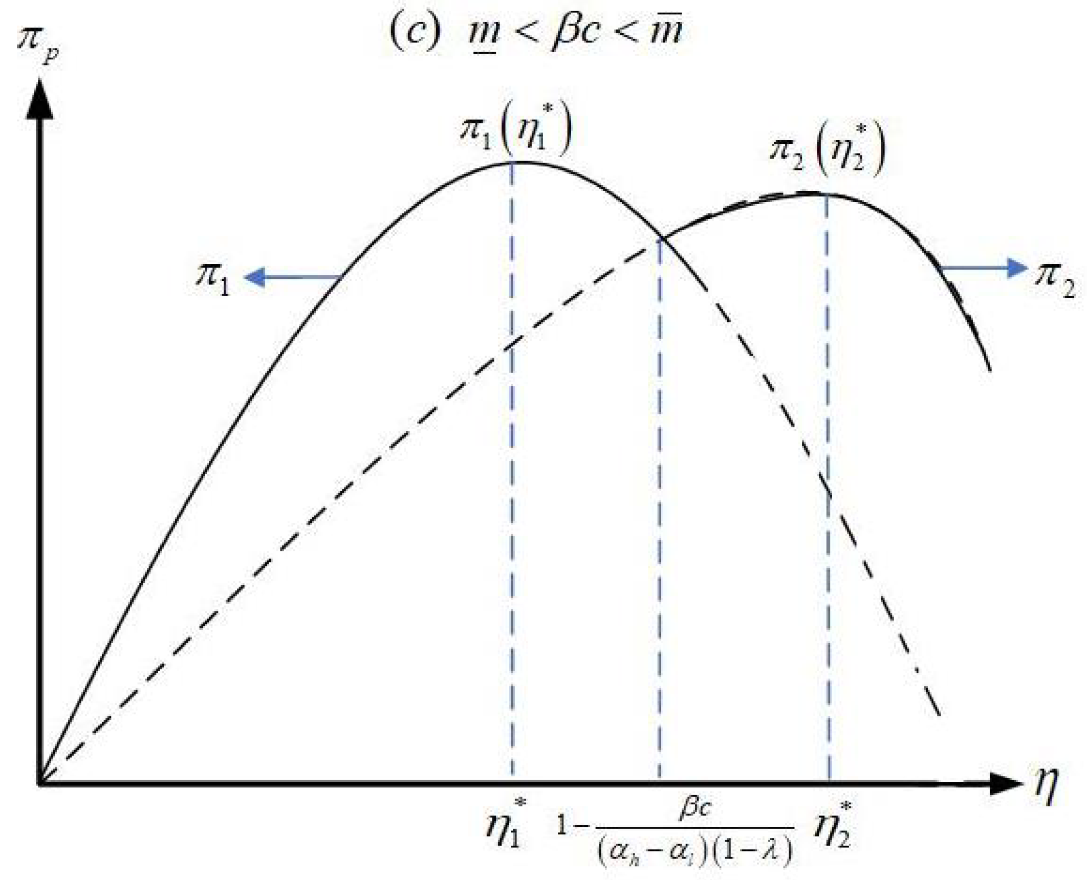 - Case 2: . In this case, for a given , the platform’s expected profit isIt is easy to verify that is first increasing and then decreasing in so that the optimal commission rate is .