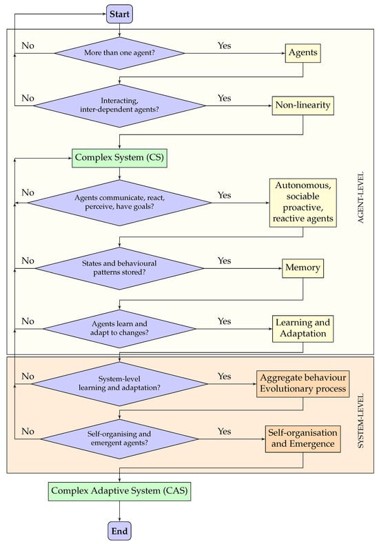 Drawing from the analysis in the previous section, here, we propose a definition of a CAS that follows a two-stage structure with preconditions. The first stage represents the complex systems part of the definition, and the second level defines a mechanism under which self-organisation and emergence can be achieved to fulfil the adaptive facet. Preconditions are attached to each stage, and the second stage cannot be considered unless all first-stage preconditions are met. The proposed definition can also act as an algorithmic framework explaining the steps that are necessary and sufficient to establish that a system is a CAS. Note that the sequencing of conditions implies a prerequisite relationship: for instance, it does not make sense to check whether agents learn and adapt to changes unless it has been confirmed that states and behavioural patterns are stored. The intention of the proposed algorithmic approach is to provide a stepwise process of establishing conditions that then allow other more complex conditions to be evaluated, which would not be possible directly. Additionally, when a condition is not met, the algorithm returns to the previous condition that was satisfied and remains there until the available information changes, reflecting the maximum subset of CS or CAS conditions that are satisfied rather than ending with an outcome of not being a CS or not being a CAS.