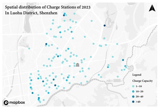 The initial charging station dataset includes 904 charging stations, providing 11,034 charging spaces. However, it only contains the address information of the stations, and there is no GPS location, which is not friendly to the subsequent experiments. Therefore, by using a Python script and the open-source Gaode API, these addresses are converted into points with GPS location information. After the tbd.clean_outofshape step, the number of charging stations within the study area was ultimately determined to be 267 with 2075 charging spaces, as shown in Table 4, and the spatial distribution of these stations according to their charging capacity is shown in Figure 2.