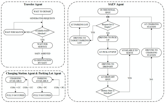 The proposed multi-agent simulation model, based on Anylogic, contained four kinds of agents: Traveler, SAEV, Parking Lot, and Charging station. The whole system can be summarized in Figure 3, the description of all states defined for these four kinds of agents can be found in Table 5, and the transitions between these states are shown in Figure 4.