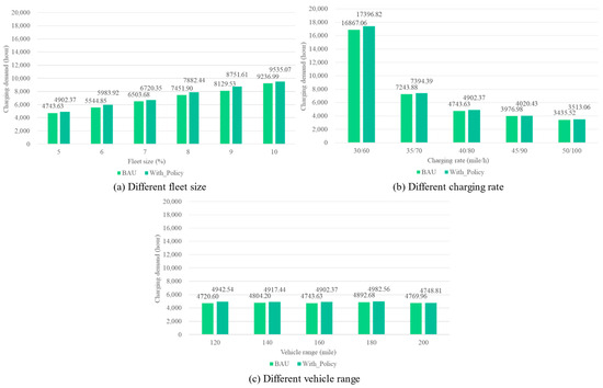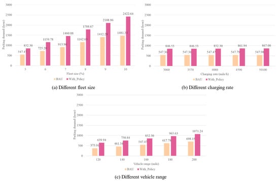 According to Figure 5 and Figure 6, as the fleet size continues to rise, the parking demand increases by nearly two times, from 547.47 h when the fleet size is only 5% (which is 669 SAEVs) to 1481.33 h with the maximized fleet size. The charging demand also saw an increase when the fleet size kept rising and the value doubled (from 4743 h to 9236 h). This is not unexpected as a larger fleet size means more SAEVs within the system are ready to serve and the travel request can be satisfied quicker, which increases the possibility of SAEVs becoming idle and choosing to park, and more SAEVs would inevitably increase the charging demand as the total number of SAEVs within the system that may need recharging has been increased, even though they may not drive to serve after charging. It is obvious that the charging demand in all scenarios (varying from 3436 h to 17,397 h) is much higher than the parking demand (376~2423 h). This is an expected result because compared with parking lots, charging stations can not only offer a place to park but also a place to recharge vehicles’ batteries. Charging is a time-consuming process, which may also help these idle SAEVs that cannot find any requests at off-peak hours without doing nothing, in this case, recharging their batteries if necessary. For the car-sharing SAEVs, they can reduce their parking time by constantly serving different requests if there are any, for those that need recharging, the duration at the charging station can also be seen as the time waiting for the new requests, so it can be said that charging demand should be the one need to be concerned more compared with its parking counterpart after taking charging behavior and vehicle range into consideration.