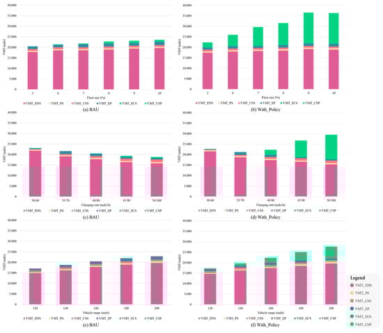 The major part of the total VMT generated is , while the others only accounted for small portions. The increase in vehicle range leads to higher values in , mainly because a wider service range brought by higher vehicle range enables SAEVs to serve more requests without recharging, while these not close enough to requests must drive to parking lots. A possible reason why increases, as the fleet size becomes larger, may be the increase in the number of vehicles capable of providing services within the system reduces the possibility of demand queues, making it more likely for fully recharged SAEVs to drive to park once they leave the charging station. The large amount of (nearly 90%) in all BAU (Business as usual) scenarios indicates that although relocating SAEVs to the next service immediately after they completed the previous one can increase the vehicle utilization rate, it can also increase the VMT within the entire road network. Since the effect of road congestion is not considered in this research, in reality, the more vehicles on the road, the more likely it is to cause congestion. Therefore, it is necessary to have a reasonable scheduling and allocation scheme of vehicles to reduce long-distance migration, thereby reducing excessive empty VMT, energy consumption, and road occupancy.