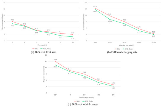 As can be seen from the figure, the charging rate has a significant impact on the response time. The average response time at a charging rate of 30/60 miles/h (12.24 min) is almost 2 times longer than a charging rate of 50/100 miles/h (1.34 min). A faster charging rate can reduce the time SAEVs spend at charging stations and enable faster replenishment of available SAEVs into the service system. The change of vehicle range also shows a similar trend to the charging rate, the response time saw its peak value (which is 11.99 min) in a scenario with the smallest vehicle range, in this case, 120 miles, and as the vehicle range continue to rise, the response time reduces to 4.58 min. This can be explained from the point of view that before vehicles consume their entire battery capacity, vehicles with longer ranges can provide service with a shorter response time. After that, even a longer charging time would be required for SAEVs with longer vehicle range, the overall result of the simulation indicates that this would not affect the total response time within the whole simulation process, it is reasonable to say that vehicles with larger vehicle range can provide mobility service with a shorter response time. As it is not feasible to expect all SAEVs to complete all requests without recharging, therefore, to reduce response time, it is recommended to consider a combination of increasing the number of service vehicles, increasing the charging rate, and increasing the vehicle range.