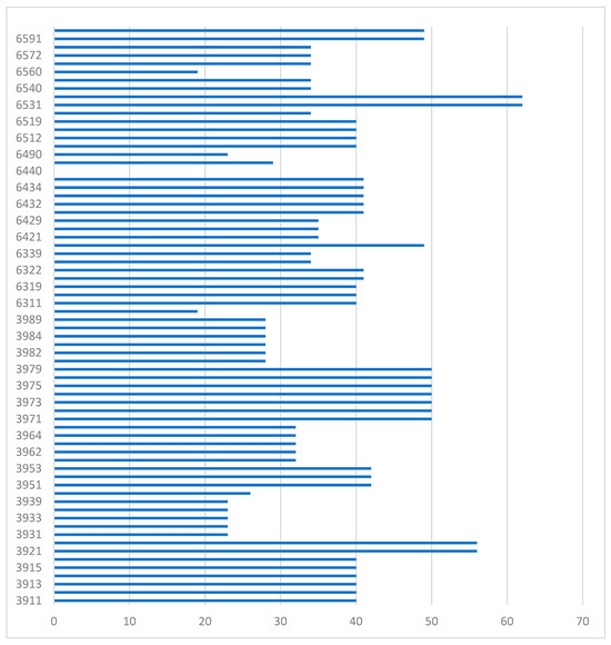 In addition to the different characteristics of relatedness in the region, the relatedness among the four-digit digital industries also varied from the perspective of the Yangtze River Delta’s integration. Observing the probability of relatedness between each four-digit industry and other industries, the relatedness of each industry was 37.17 on average, accounting for more than 50% of the total number of industries. This result shows that digital industries in the Yangtze River Delta region are well-coordinated. In addition, the highest probability of relating with other industries was identified in the information system integration service (6531) and Internet of Things technology service (6532) industries, which were both at 62/70. The smallest value was yielded by the internet security services (6440) industry, as no other industries were found to be related. Figure 1 shows at a high level how each four-digit digital industry relates to the others in terms of quantity.