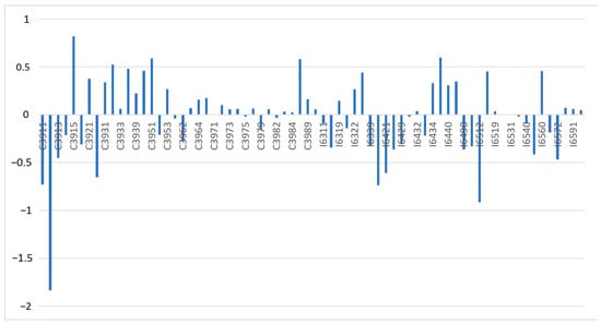 We further calculated and constructed the technical complexity index (TCI) []. According to the technical complexity of 70 four-digit digital industries, we found that the most complex industries were information security equipment manufacturing (C3915) and computer parts manufacturing (C3912). Overall, the technical complexity of internet information platform and professional equipment manufacturing industries was high, while the technical complexity of information storage and satellite broadcasting industries was relatively low, which is in line with the innovative characteristics of current digital technology. Figure 2 shows the technical complexity indexes of 70 digital industries and four-digit industries in the Yangtze River Delta region (to facilitate the subsequent regression analysis, the TCI index is the result of a standardized treatment; thus, a larger value indicates higher complexity).
