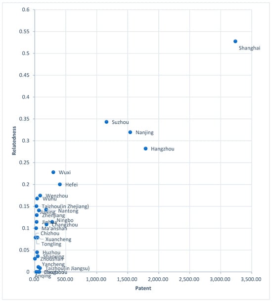 To explore the spatial pattern of relatedness and determine the disparity in relatedness among the 27 cities in the Yangtze River Delta region, we calculated the average relatedness density value for the 70 four-digit industries in each city (). The larger the value of , the higher the average level of coordination among all four-digit industries in a city. The average number of patent applications in 70 four-digit industries was also calculated in each city () to determine each city’s innovation capabilities. We then used a scatter diagram to visualize the potential association between relatedness and innovation. As shown in Figure 3, only Shanghai, Hangzhou, Suzhou, and Nanjing, as the major developed cities and creative hubs, performed well in both the innovation and relatedness dimensions. However, many cities, despite an evident level of relatedness, did not equally produce solid innovation outputs. This finding suggests a less straightforward relationship between technological relatedness and regional innovation capabilities in the scenario of this study, where differences in socio-economic status may play a vital role in the process of digital industry development.