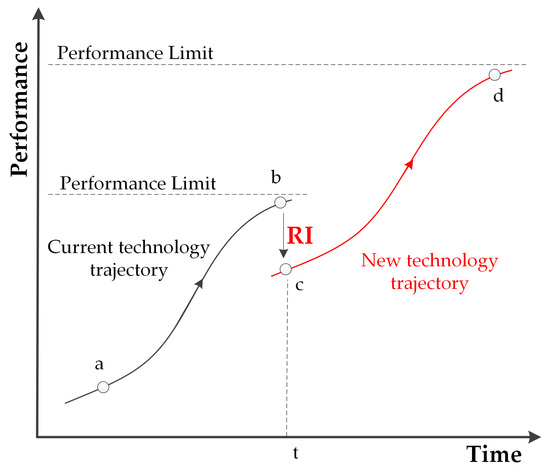 The traditional dichotomy divides technological innovation into incremental innovation (II) and RI according to the different degrees of innovation [17]. As shown in Figure 1, the difference between RI and II can be understood with the help of technological S-curves. The whole process of II occurs on the same S-curve, such as the two curves a–b and c–d in Figure 1. A discontinuous break in the S-curve occurs from b to c, and a new S-curve is created and gradually replaces the current curve, which is the result of RI. Even though the performance of the new S-curve is not as superior as that of the current technology at the beginning, it will break through the performance limit of the current technology with time.