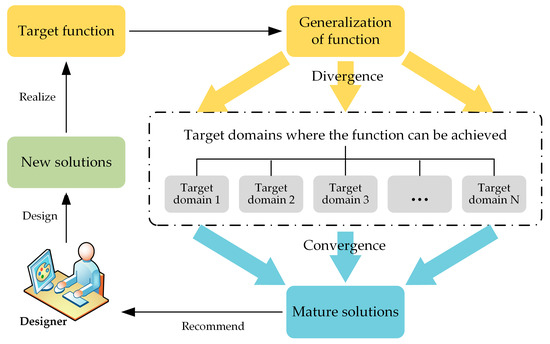 As shown in Figure 2, FOS aims to achieve the target function by searching the generalized problem model and transferring the cross-domain knowledge solutions to the problematic engineering system [15,27]. The traditional search engine searches knowledge based on keyword search, which is challenging to extend to other domains, but FOS can solve this problem and improve problem-solving efficiency.