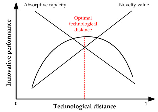 However, knowledge from different domains has different impacts on firms’ innovation performance, and to measure the relationship between them, Jaffe [37,38] proposed the concept of TD. As shown in Figure 3, there is an inverted U-shaped relationship between TD and innovation performance [39,40]. The introduction of cross-domain knowledge with a small TD, while conducive to absorptive capacity, is detrimental to generating high-level innovations and makes it challenging to achieve RI. On the contrary, the introduction of cross-domain knowledge with a large TD can hinder firms’ absorptive capacity due to its high novelty value, again not conducive to radical innovative design. Therefore, cross-domain knowledge at a moderate TD is relatively more conducive to facilitating radical innovative design [16].
