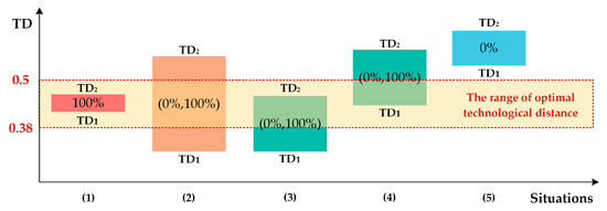 Therefore, this paper uses the value range of 0.38–0.5 as the range of optimal technical distance. The optimal target domain is determined by comparing the overlap between the range of TD and [0.38, 0.5]. The higher the overlap, the more likely knowledge in that target domain will inspire radical innovative designs. As shown in Figure 5, the following are the five possible situations and the specific equations for calculating them: