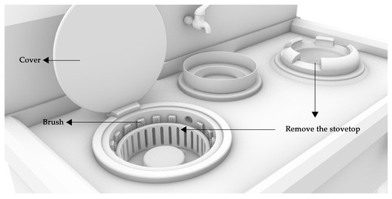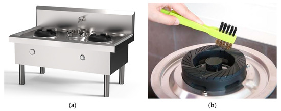 As an essential cooking equipment, the stove (shown in Figure 6a) has been widely used in commercial and home kitchens. However, the stovetop (shown in Figure 6b) is often clogged with sludge and other greasy substances, resulting in an insufficient flame or even the inability to complete the sending flame, increasing the probability and cost of equipment maintenance. For this problem, the existing solution mainly relies on manual physical cleaning, which is not only inefficient but also susceptible to damaging the stovetop. Therefore, this paper will verify the effectiveness of the proposed method by designing a stovetop cleaning device.