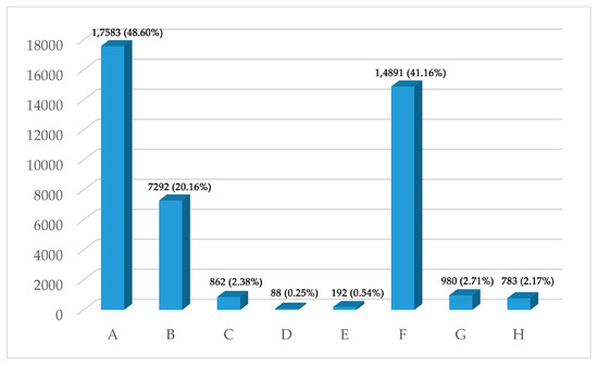 The first level of the IPC system consists of eight sections, while the second level consists of hundreds of classes. This categorization results in TD1, measured using data from the first level of the IPC system, being less than the actual TD, while TD2, measured using data from the second level of the IPC system, is bigger than the actual. Therefore, in this paper, the two levels of classification number data will be calculated separately based on the min-complement distance, and the two calculated values will be formed into a value range [TD1, TD2] to represent the TD between each domain. The min-complement distance is calculated as shown in Equation (2) [42]: