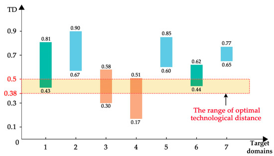 To determine the optimal target domain, the specific value of the optimal TD should first be defined. Noteboom et al. [39] argued that, when TD ∈ [0, 1], the domain that provided the optimal cross-domain knowledge should be the one that lies in the category of TD = 0.5. After hypothesizing and validating knowledge transfer between firms, Wuyts et al. [46] concluded that the optimal TD is 0.38. Gao [47] analyzed the effect of TD on RI, and the study showed that the optimal value of TD is approximately 0.4. The optimal TD is not unique because novelty value and absorptive capacity are not equivalent [48].