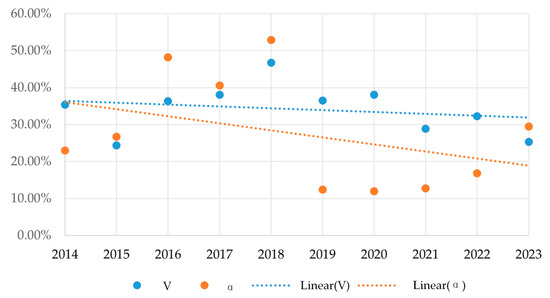 Patent application data can be used as a basis for judging whether a technical topic is at a mature stage or not. The judgment indicators include the technology growth rate (V) and the index of technology maturity (α), as shown in Equations (6) and (7). When both V and α have a decreasing trend, the technology topic is at the maturity stage [50].
