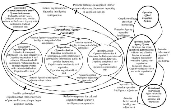 This figure is a cognition–affect model which recognises how the autonomous functionality of cognition and affect subagencies mutually interact, the interactions occurring through their operative systems. The model of a cognition–affect agency creates both rational cognition and emotional subcontexts. The operative system has an anterior aspect in relation to the dispositional figurative system, the two combining as an autopoietic couple, preceding the sustentative system that seeks to ensure homeostatic processes. Autopoiesis and autogenesis are higher-order process intelligences autonomously operating within both cognition and affect. The intelligences have reverse trajectories, one from a posterior system and one from an anterior system. The three types of intelligence are behavioural, operative, and figurative, all having a circular reflexive causality.
