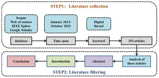 Step 1: Literature collection: As depicted in Figure 1, papers on the digital thread have emerged since 2015. Therefore, the timespan for literature collection spans from January 2015 to 2023. The selected databases include Scopus, the Web of Science, Google Scholar, and IEEE Xplore. Keywords were used to examine whether the term “digital thread” is presented in the titles and abstracts of the retrieved documents. Following the screening process, 292 articles containing the keywords were initially retained.