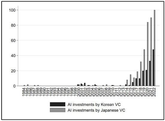 Finally, our focus on VCs within two major Asian economies, Japan and South Korea, imparts geographic diversity to the literature. Despite representing a vital nexus of technological innovation and entrepreneurship, Asia-located VCs have received limited scholarly attention thus far [48,49]. Our multi-country dataset encompasses investments in AI startups by VCs from 1984 to 2022, providing a foundation to advance contextual insights into Asian VCs’ syndication dynamics and engagement with frontier technologies.