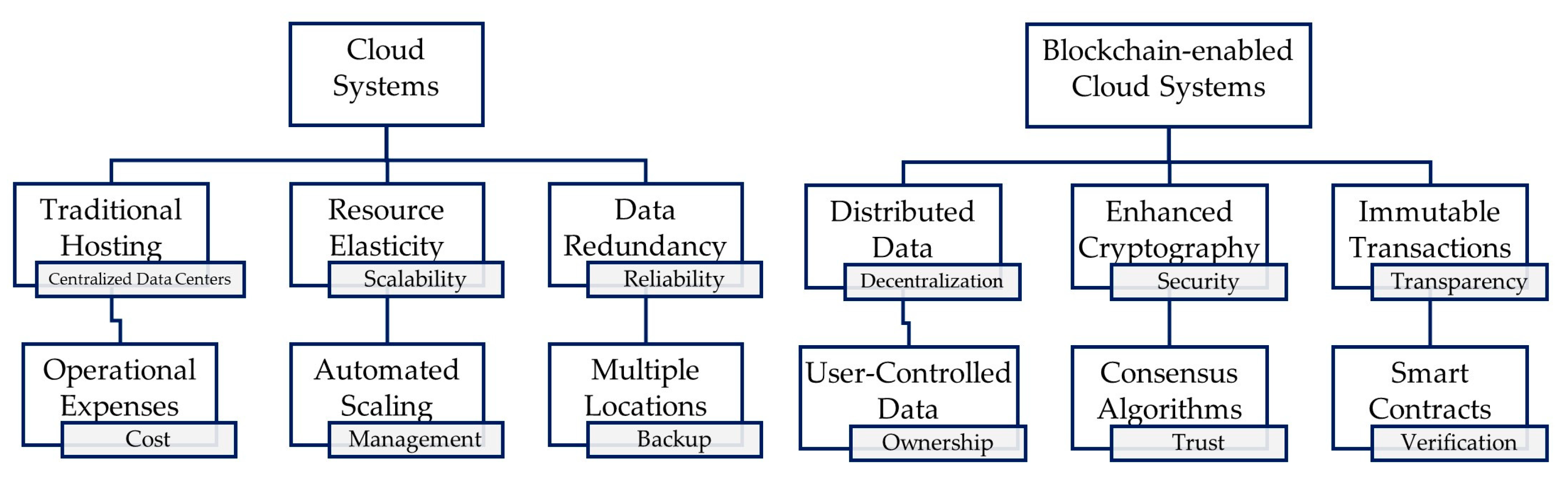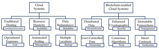 Conventional cloud systems vs. Blockchain-enabled cloud systems.