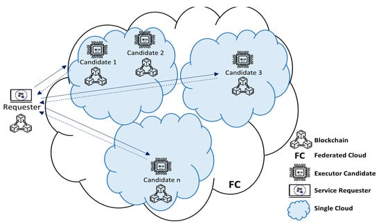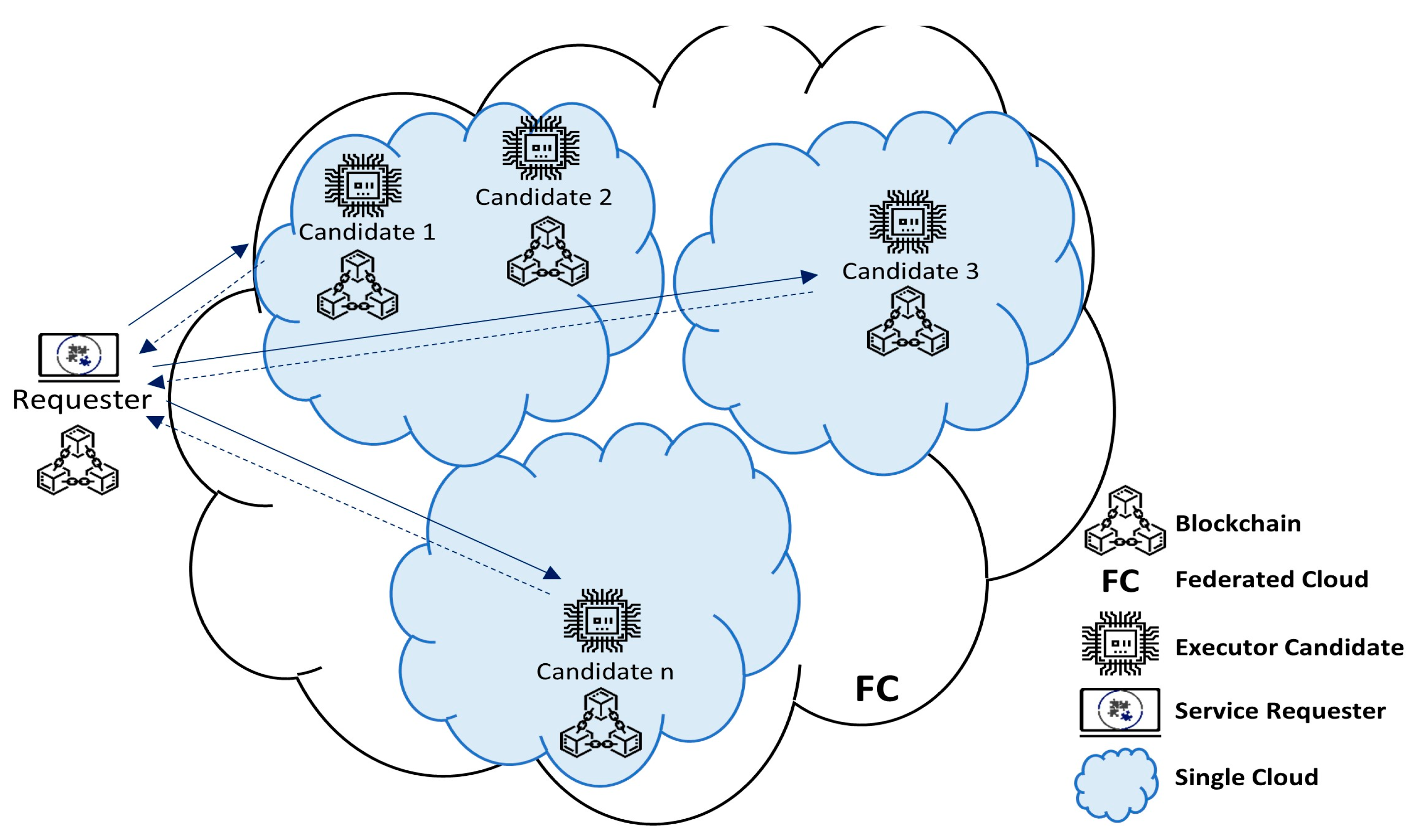 We are currently depending on cloud computing systems for our everyday tasks, whether it is for work, personal, commerce, financial transactions, or data storage tasks, to name a few. Cloud services can be offered through a single provider or multiple clouds federated as a single one with a variety of services, called federated cloud, which is the interconnection and cooperation of multiple cloud computing environments []. The IEEE 2302–2021 Standard for Intercloud Interoperability and Federation (SIIF) highlights the importance of establishing common mechanisms and APIs to enable resource sharing among different stakeholders, fostering the testing of complex technologies in a federated environment []. The need for more secured heterogeneous cloud services from federated clouds and the demand for high efficiency in performing tasks on multiple clouds are increasing nowadays, especially in cases that require high confidentiality and reliability [,,,]. As known, there are potential risks associated with cloud computing, like exposure or leakage of data, unauthorized access to data, insider threats, regulatory violations, and others [,,,]. Also, there are additional challenges that need to be managed to make it more suitable for advanced use cases. For example, sensitive data or computing tasks may require a careful selection of cloud resources to process these tasks securely and efficiently, or they might need specialized software or hardware to properly execute these tasks. Therefore, to minimize the centralization issue of cloud platforms on their respective providers, we can benefit from the evolution of web 3.0, which allows us to utilize the capabilities of emerging technologies to overcome these challenges to some extent and achieve the desired enhancements. One of these technologies is Blockchain technology, with its unique features that include immutability, decentralization, enhanced security, and faster settlement through its smart contract system [].