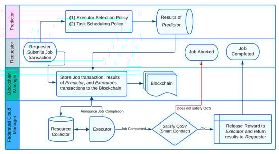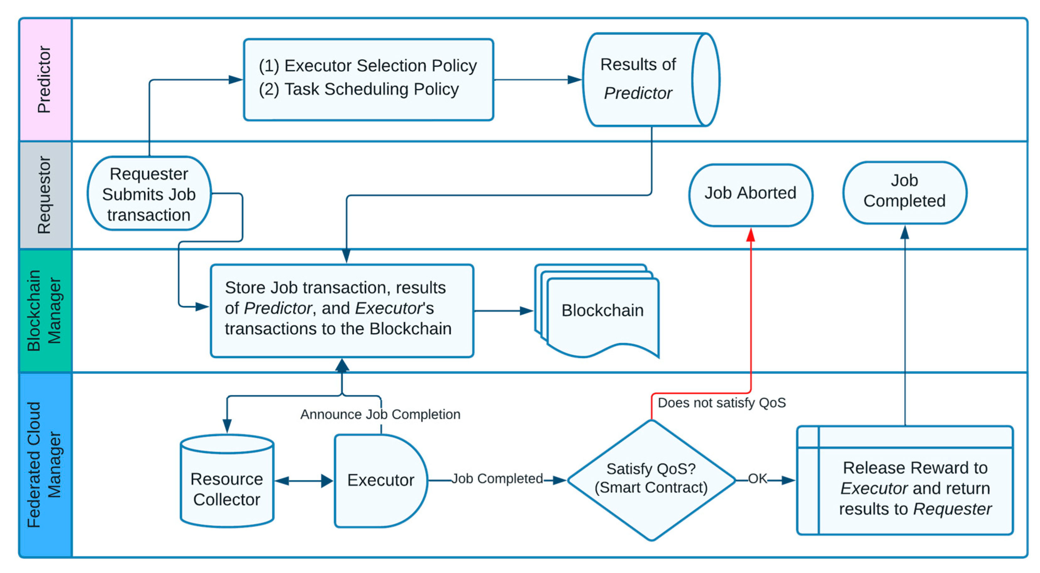 For the executors, to obtain the highest reward, they should allocate the related computational resources to successfully execute the job and meet the QoS requirements efficiently. After successful job execution, they send a completion announcement on the Blockchain when it is completed. This process will either return true if successful (no violations of QoS) or false if otherwise. Finally, and only if successful, the smart contract will release the allocated tokens, and the executor will obtain the reward.