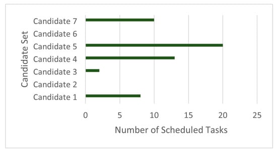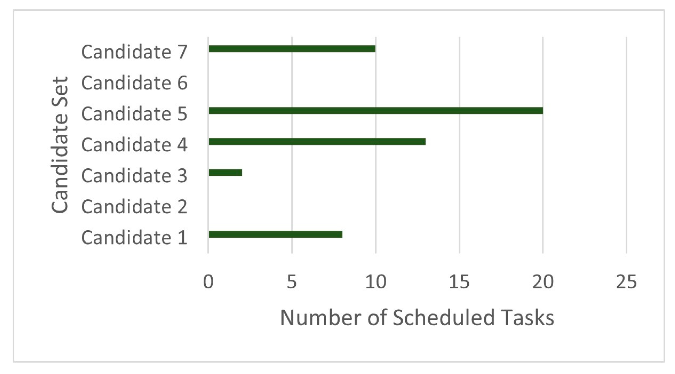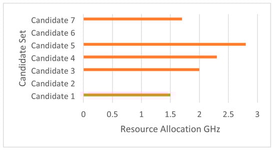 At the same decision epoch, candidate 5 is assigned with 20 tasks (chunks of the job workload), as shown in Figure 8, and this candidate utilizes 2.8 GHz of computing power to completely execute the job, as shown in Figure 9. The same goes for candidate 7, where only 10 tasks were assigned to this candidate, and it utilizes 1.7 GHz of computing power. This proves that while the Predictor aims to achieve the highest total execution reward possible, it also carefully evaluates the candidates and schedules tasks accordingly.
