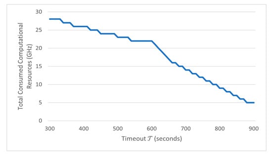 To test the computational resource allocation capability of the Predictor and the effect of the QoS requirements, we examined the performance in terms of the total consumed computational resources. Figure 10 depicts how the Predictor managed to save the consumed computational resources with varying timeout constraints. Evidently, fewer computing resources are usually required when we increase the timeout and have a flexible QoS.