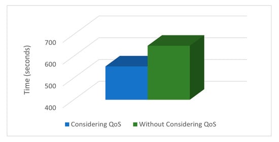 This indicates that the proposed DQL-based Predictor has optimized its selection of from the 15 candidates available in and met the required QoS, ≤ 600 s. As shown in Figure 11, the time taken without considering the QoS is 648 s, and only 553 s using the proposed mechanism that considers the QoS to complete the same job.