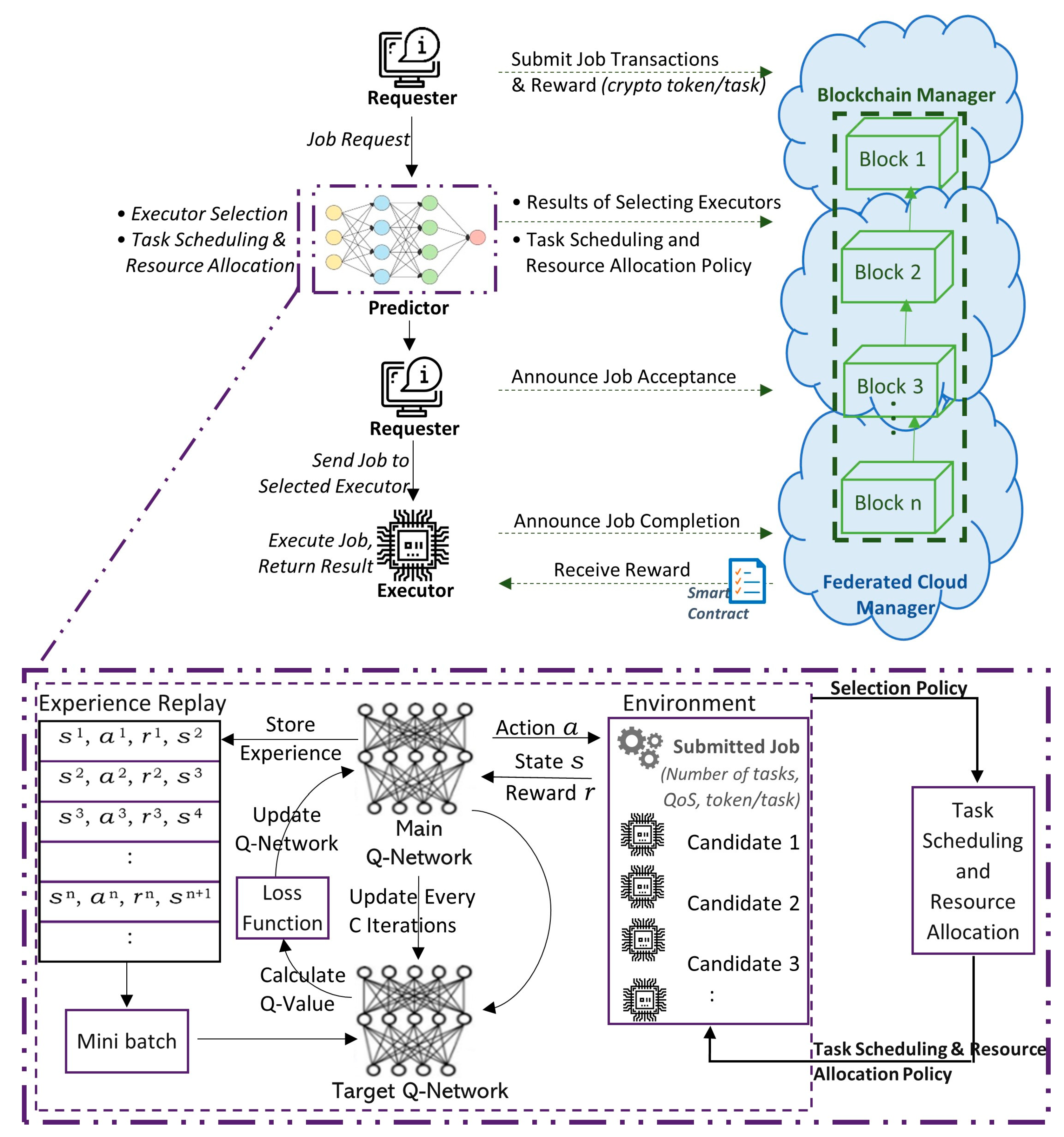 The role of the task scheduling and resource allocation module, the Predictor, is to perform the DQL algorithms to predict the appropriate task scheduling and resource allocation policy. For that, we designed a mechanism of evaluation to assist in the process of executor selection from the available candidates by considering the computation capability of the candidates in addition to their stakes and reputation. The DQL approach is used here to deal with the complexity of the system and the huge action space related to the execution workloads, QoS requirements, and characteristics of the candidates, as explained below, which requires us to design an approach to create a manageable solution space in the decision process. To some extent, this methodology handles the enormous state space and efficiently meets the workload adaptation and QoS requirements [,].