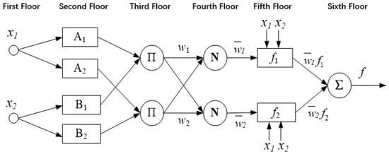 In Figure 1, the connecting lines between nodes depict the flow of information, and square and circular nodes represent adjustable and non-adjustable parameters, respectively. The diagram reveals that only floors 2 and 5 contain adjustable parameters. Nodes on the same floor share identical functions. With the input of the ith node in the kth floor denoted as Oik, the functions of each floor within the ANFIS structure are as follows []: