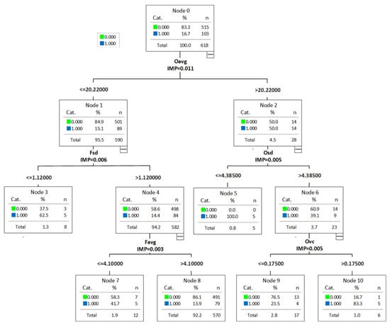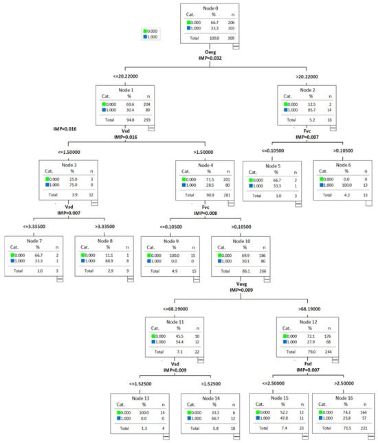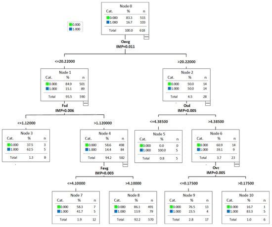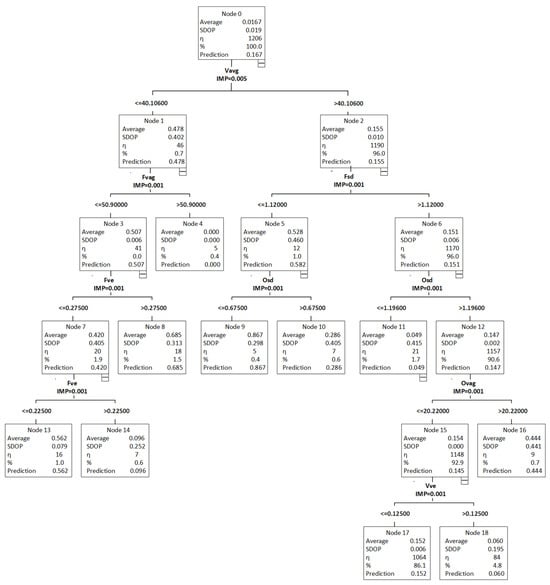 Similarly, with the same training and evaluation samples as used under the ANFIS method and based on the dynamic value-at-risk definitions in both the ANFIS and previously described decision tree modeling approaches, decision tree results for the 10-min, 20-min, and 30-min data collection durations were derived (see Figure 3, Figure 4 and Figure 5). Overall, the decision tree algorithm has achieved good results. In the final obtained node, IM < 0.05 (see Figure 2, Figure 3, Figure 4 and Figure 5) indicates good classification performance of the node.