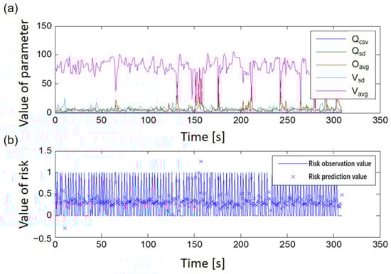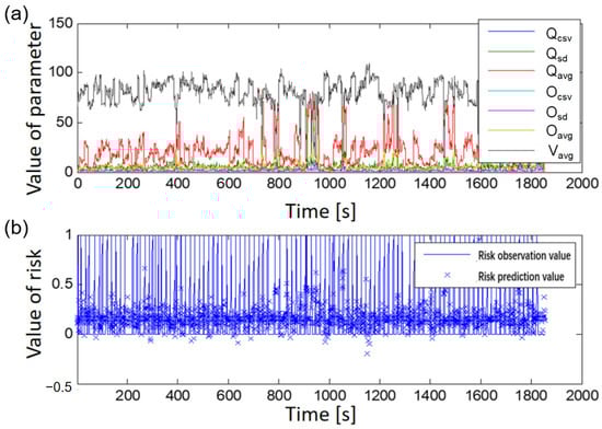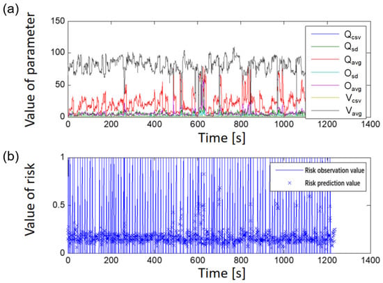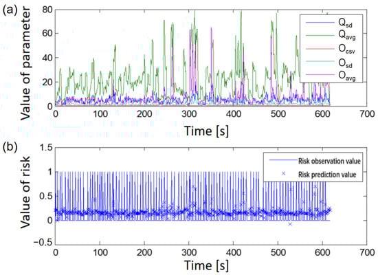 Model input–output data curves (based on 5-min data). (a): The value of parameters in the whole process; (b): The value of risk in the whole process.