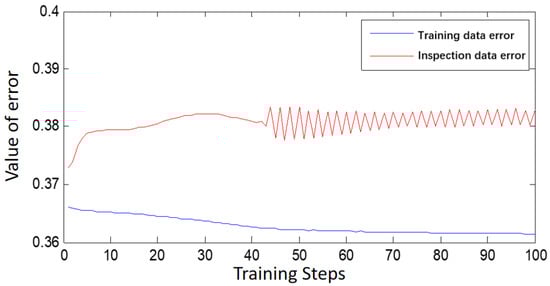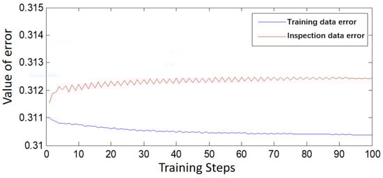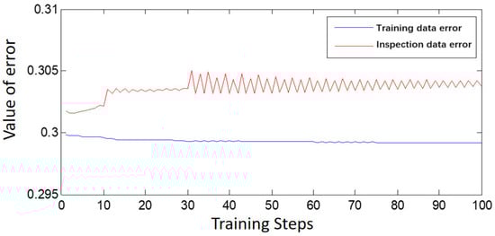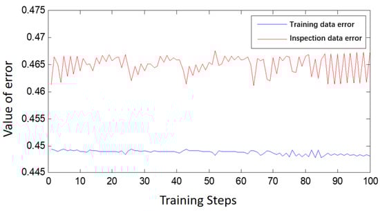 Based on the data of the aforementioned main factors of the upstream detector cross section of the accident group for the 10-min period prior to accident occurrence and the corresponding data of the control group, these parameters were imported into the model. This enabled ANFIS-based dynamic risk assessment to be modeled. In addition, the output parameter set represented traffic operation risk values at 10-min intervals for both the accident and control groups. At this juncture, it could be posited that risk values increased as the accident moment approached and decreased as the accident moment passed. Within the 10-min period prior to the accident, risk values showed a linear increment. For the accident group, the risk value during the first 5-min interval prior to the accident was defined as 1, whereas that during the 5- to 10-min interval prior to the accident was defined as 0. By contrast, the control group’s risk values remained at 0 for all intervals. Based on the same training and evaluation samples, Figure 8 and Figure 9 display the input–output data curves of the dynamic risk assessment model based on 10-min data and the training step-error curves of the model, respectively. The figures show that the errors were reduced as compared with the results based on 5-min data (see Figure 7 and Figure 9 and Table 2).